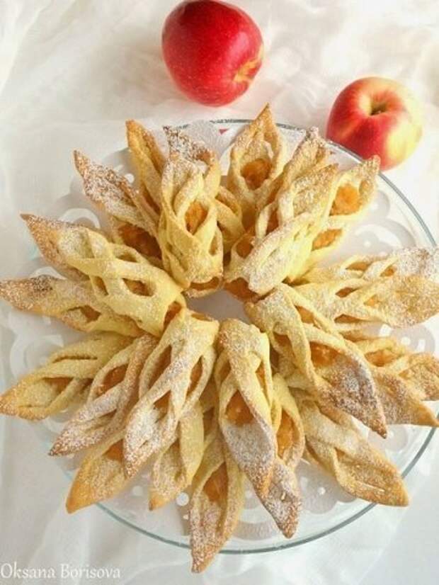 3. Разогрейте духовку до 180 градусов. Рабочую поверхность присыпьте слегка мукой. Отрежьте кусочек теста, раскатайте его в круг около 3 мм толщиной и разрежьте на треугольники. В каждом треугольнике сделайте прорезы как показано на фото. Положите начинку и заверните сначала одну сторону, а затем другую.